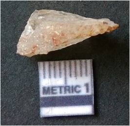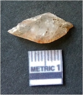 | Description / विवरण | The quartz flake has sharp flaked edges and pointed ends as a result of flaking. The piece is semi-transparent in nature with irregular fracture pattern. The piece is roughly triangular in shape and has a prominent bulb of percussion. |