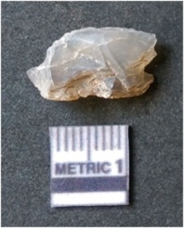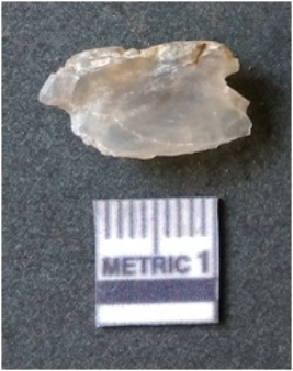 | Description / विवरण | The flake has irregular fracture pattern and sharp flaked edges as a result of lithic knapping activity. The piece is pale, with surfacial flake scars and a bulbous end. The flake is of smoky quartz variety, grayish in colour and translucent in appearance. |
