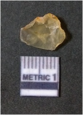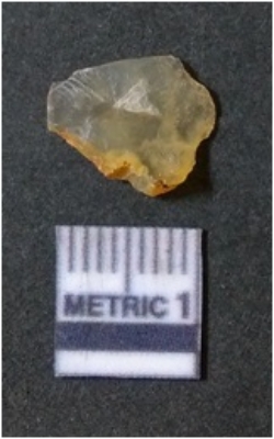 | Description / विवरण | It is chalcedony flake, translucent in appearance. The piece shows sharp pointed ends and flake scars on the surface as a result of flaking. The piece shows a bulb of percussion. |