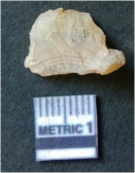 | Description / विवरण | The quartz flake has sharp flaked edges and pointed ends as a result of flaking. The piece is semi-transparent in nature with irregular fracture pattern. The piece is roughly triangular in shape and has a prominent bulb of percussion. |