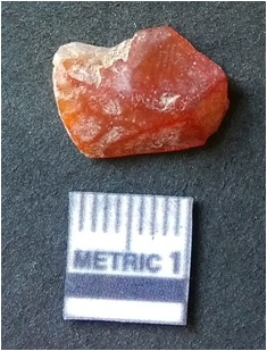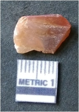 | Description / विवरण | The carnelian flake is crypto crystalline with sharp flaked edges and nature bulb of percussion. The piece is pale in color with surfacial flake scars. |