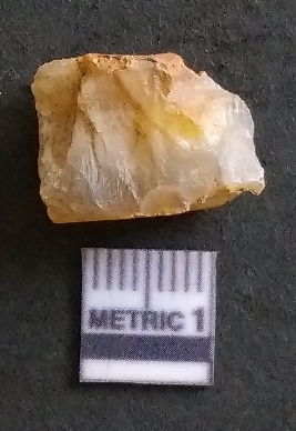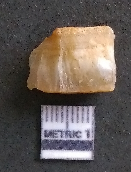 | Description / विवरण | It is a chalcedony flake, with a bulb of percussion on the ventral side. Cortex on one end. |