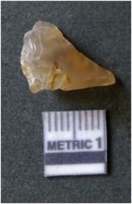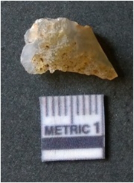 | Description / विवरण | It is chalcedony flake, translucent in appearance. The piece shows sharp pointed ends and flake scars on the surface as a result of flaking. The piece shows a bulb of percussion. |