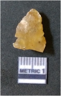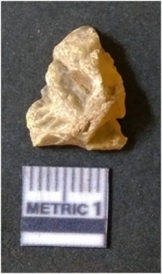 | Description / विवरण | It is chalcedony flake, translucent in appearance. The piece shows sharp pointed ends and flake scars on the surface as a result of flaking. The piece shows a bulb of percussion. |