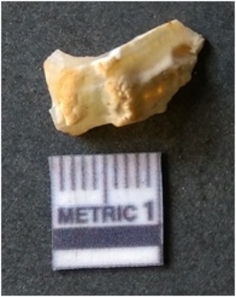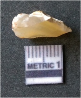 | Description / विवरण | It is chalcedony flake, translucent in appearance. The piece shows sharp pointed ends and flake scars on the surface as a result of flaking. The piece shows a bulb of percussion. |