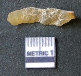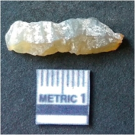 | Description / विवरण | The elongated flake has sharp fake edges and negative flake scars on the surface. The piece is roughly cylindrical in shape and composed f crypto crystalline matrix. |