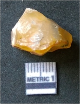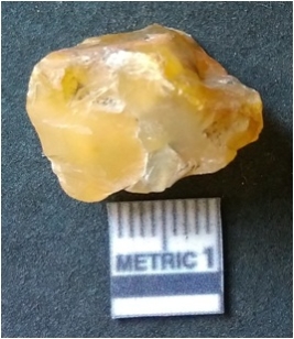 | Description / विवरण | It is chalcedony flake, translucent in appearance. The piece shows sharp pointed ends and flake scars on the surface as a result of flaking. The piece shows a bulb of percussion. Chunky piece with flake scars on the surface. |