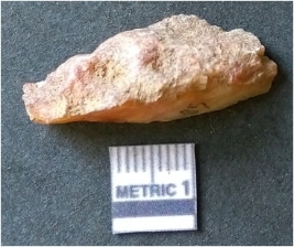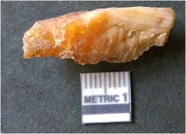 | Description / विवरण | The banded agate piece is elongated, with sharp edges and bulb of percussion. The piece is pale pinkish in color and has some part of cortex on the ventral side of the flake. |