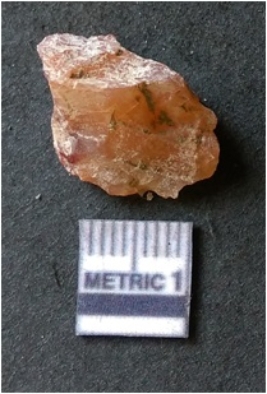 | Description / विवरण | It is chalcedony flake, translucent in appearance. The piece shows sharp pointed ends and flake scars on the surface as a result of flaking. The piece shows a bulb of percussion. |