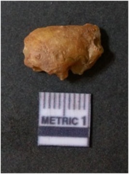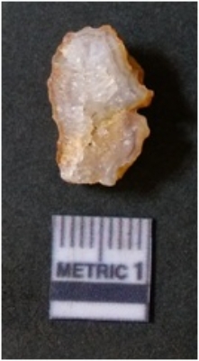 | Description / विवरण | The quartz flake has sharp flaked edges and pointed ends as a result of flaking. The piece is semi-transparent in nature with irregular fracture pattern. The piece is roughly triangular in shape and has a prominent bulb of percussion. |