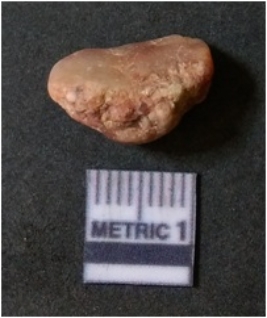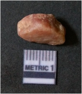 | Description / विवरण | The flake has irregular fracture pattern and sharp flaked edges as a result of lithic knapping activity. The piece is pale, with surfacial flake scars and a bulbous end. The quartz flake is rosy white in colour. |