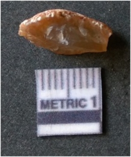 | Description / विवरण | The jasper fragment has sharp flaked edges and a bulb of percussion. The piece is dark in color and has crypto crystalline matrix. Flake scars are visible on the surface and bulb of percussion is present as a result of lithic knapping activity. |