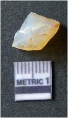 | Description / विवरण | It is chalcedony flake, translucent in appearance. The piece shows sharp pointed ends and flake scars on the surface as a result of flaking. The piece shows a bulb of percussion. |