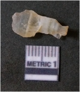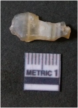 | Description / विवरण | The banded agate piece is crystalline in nature, with a smooth fracture pattern and visible bands on the flaked sides. The piece is pale in color and has sharp flaked ends. |