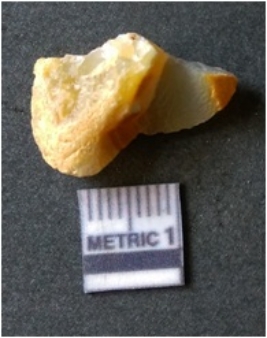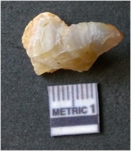 | Description / विवरण | It is chalcedony flake, translucent in appearance. The piece shows sharp pointed ends and flake scars on the surface as a result of flaking. The piece shows a bulb of percussion. |