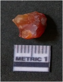 | Description / विवरण | It is carnelian flake red in color, with sharp flakes edges and a small bulb of percussion owing to knapping activity. The piece has sharp flaked edges and a crypto-crystalline matrix. |