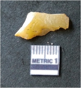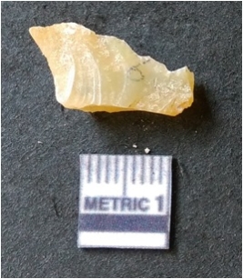 | Description / विवरण | It is chalcedony flake, translucent in appearance. The piece shows sharp pointed ends and flake scars on the surface as a result of flaking. The piece shows a bulb of percussion. |