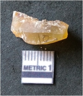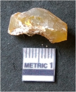 | Description / विवरण | It is chalcedony flake, translucent in appearance. The piece shows sharp pointed ends and flake scars on the surface as a result of flaking. The piece shows a bulb of percussion. |