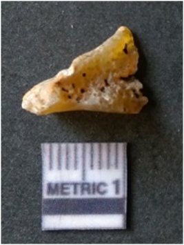 | Description / विवरण | It is chalcedony flake, translucent in appearance. The piece shows sharp pointed ends and flake scars on the surface as a result of flaking. The piece shows a bulb of percussion. |