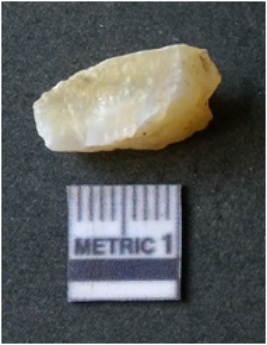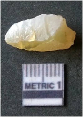 | Description / विवरण | It is chalcedony flake, translucent in appearance. The piece shows sharp pointed ends and flake scars on the surface as a result of flaking. The piece shows a bulb of percussion. |
