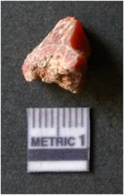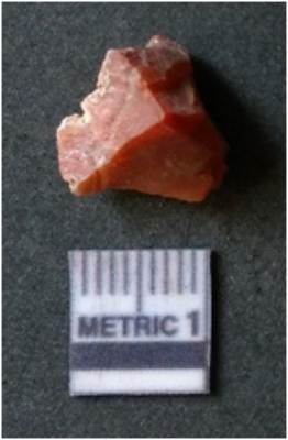 | Description / विवरण | It is carnelian flake red in color, with sharp flakes edges and a small bulb of percussion owing to knapping activity. The piece has sharp flaked edges and a crypto-crystalline matrix. |