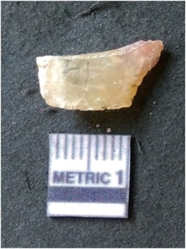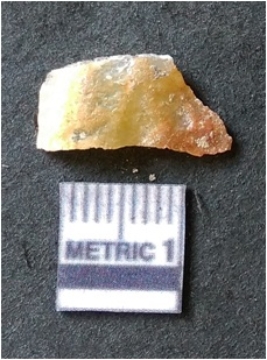 | Description / विवरण | It is chalcedony flake, translucent in appearance. The piece shows sharp pointed ends and flake scars on the surface as a result of flaking. The piece shows a bulb of percussion. |