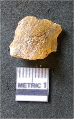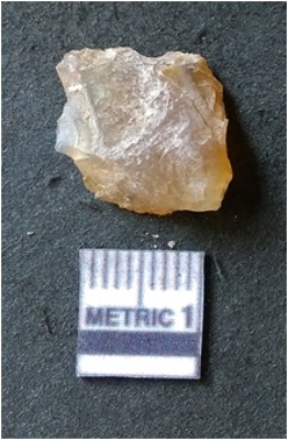 | Description / विवरण | It is chalcedony flake, translucent in appearance. The piece shows sharp pointed ends and flake scars on the surface as a result of flaking. The piece shows a bulb of percussion. |