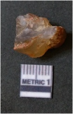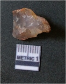 | Description / विवरण | The flake has irregular fracture pattern and sharp flaked edges as a result of lithic knapping activity. The piece is pale, with surfacial flake scars and a bulbous end. The flake is of smoky quartz variety, grayish in colour and translucent in appearance. |
