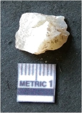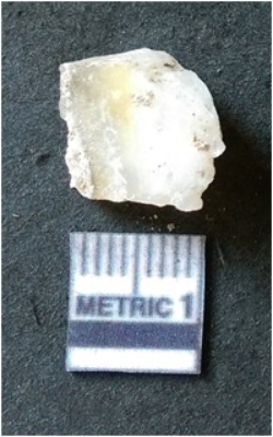 | Description / विवरण | The quartz flake has sharp flaked edges and pointed ends as a result of flaking. The piece is semi-transparent in nature with irregular fracture pattern. The piece is roughly triangular in shape and has a prominent bulb of percussion. |