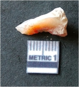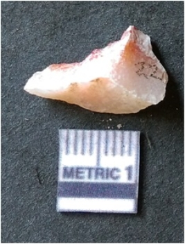 | Description / विवरण | The flake has irregular fracture pattern and sharp flaked edges as a result of lithic knapping activity. The piece is pale, with surfacial flake scars and a bulbous end. The quartz flake is rosy white in colour. |