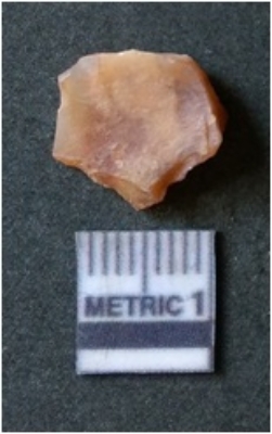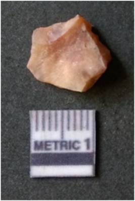| Description / विवरण | The flake has irregular fracture pattern and sharp flaked edges as a result of lithic knapping activity. The piece is pale, with surfacial flake scars and a bulbous end. The quartz flake is rosy white in colour. |