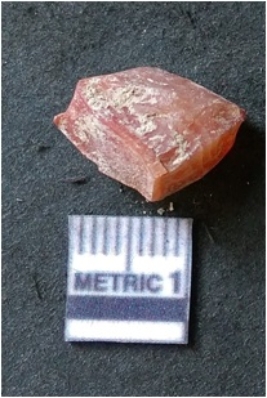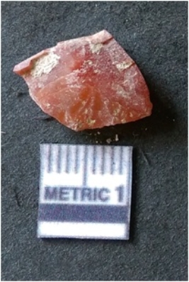 | Description / विवरण | It is carnelian flake red in color, with sharp flakes edges and a small bulb of percussion owing to knapping activity. The piece has sharp flaked edges and a crypto-crystalline matrix. |