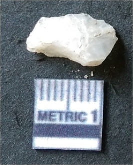 | Description / विवरण | The quartz flake has sharp flaked edges and pointed ends as a result of flaking. The piece is semi-transparent in nature with irregular fracture pattern. The piece is roughly triangular in shape and has a prominent bulb of percussion. |