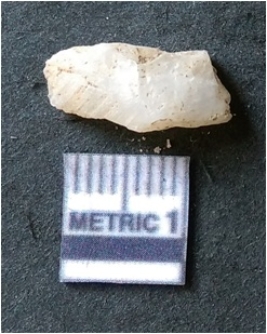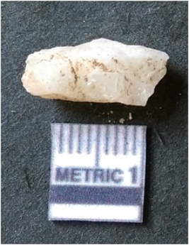 | Description / विवरण | The quartz flake has sharp flaked edges and pointed ends as a result of flaking. The piece is semi-transparent in nature with irregular fracture pattern. The piece is roughly triangular in shape and has a prominent bulb of percussion. |