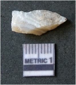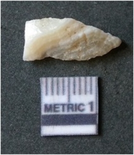 | Description / विवरण | The banded agate piece is crystalline in nature, with a smooth fracture pattern and visible bands on the flaked sides. The piece is pale in color and has sharp flaked ends. |