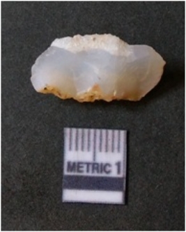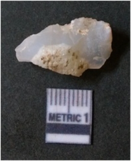 | Description / विवरण | The quartz flake has sharp flaked edges and pointed ends as a result of flaking. The piece is semi-transparent in nature with irregular fracture pattern. The piece is roughly triangular in shape and has a prominent bulb of percussion. |