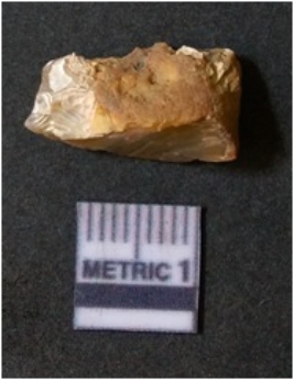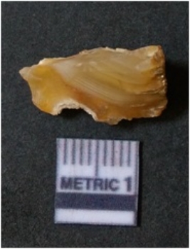 | Description / विवरण | It is chalcedony flake, translucent in appearance. The piece shows sharp pointed ends and flake scars on the surface as a result of flaking. The piece shows a bulb of percussion. |
