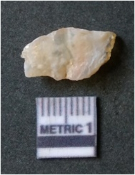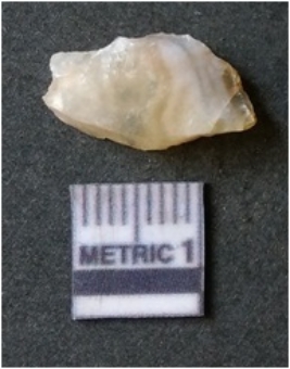 | Description / विवरण | The banded agate piece is crystalline in nature, with a smooth fracture pattern and visible bands on the flaked sides. The piece is pale in color and has sharp flaked ends. |