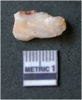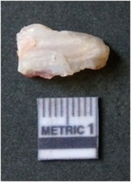| Description / विवरण | The banded agate piece is crystalline in nature, with a smooth fracture pattern and visible bands on the flaked sides. The piece is pale in color and has sharp flaked ends. |
