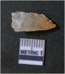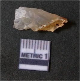 | Description / विवरण | The quartz flake has sharp flaked edges and pointed ends as a result of flaking. The piece is semi-transparent in nature with irregular fracture pattern. The piece is roughly triangular in shape and has a prominent bulb of percussion. |