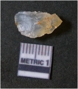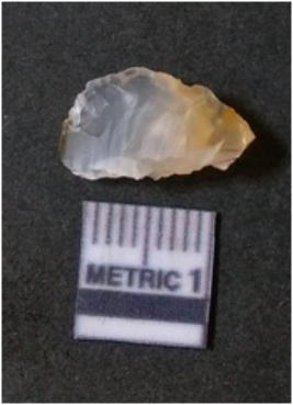 | Description / विवरण | The quartz flake has sharp flaked edges and pointed ends as a result of flaking. The piece is semi-transparent in nature with irregular fracture pattern. The piece is roughly triangular in shape and has a prominent bulb of percussion. |