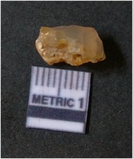 | Description / विवरण | It is chalcedony flake, translucent in appearance. The piece shows sharp pointed ends and flake scars on the surface as a result of flaking. The piece shows a bulb of percussion. |