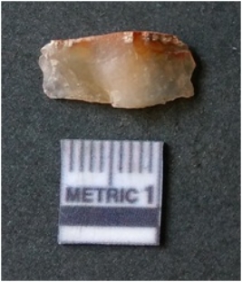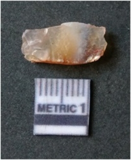 | Description / विवरण | It is chalcedony flake, translucent in appearance. The piece shows sharp pointed ends and flake scars on the surface as a result of flaking. The piece shows a bulb of percussion. |