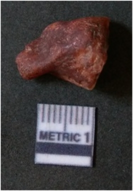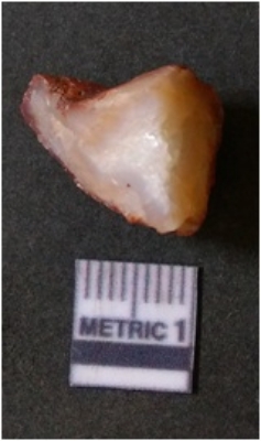 | Description / विवरण | The quartz flake has sharp flaked edges and pointed ends as a result of flaking. The piece is semi-transparent in nature with irregular fracture pattern. The piece is roughly triangular in shape and has a prominent bulb of percussion. |