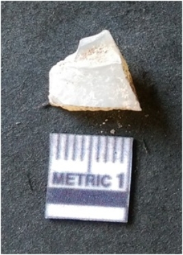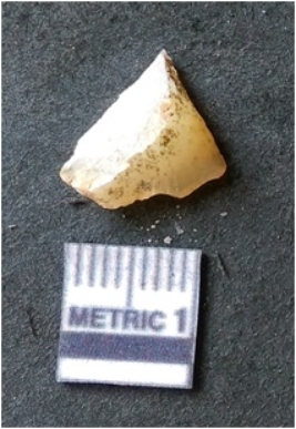 | Description / विवरण | It is chalcedony flake, translucent in appearance. The piece shows sharp pointed ends and flake scars on the surface as a result of flaking. The piece shows a bulb of percussion. |