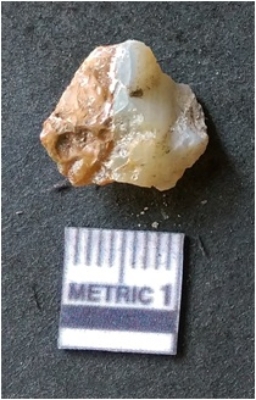 | Description / विवरण | The banded agate piece is crystalline in nature, with a smooth fracture pattern and visible bands on the flaked sides. The piece is pale in color and has sharp flaked ends. |