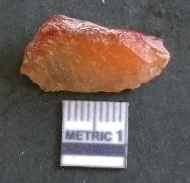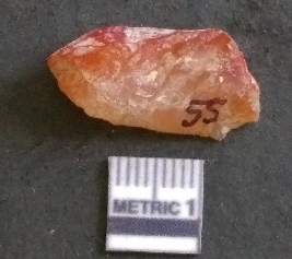 | Description / विवरण | It is a carnelian flake, with a striking platform with bulb of percussion on the ventral side. It is orangish in color, flake edges on the surface with ripple on it due to heavy percussion. |