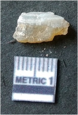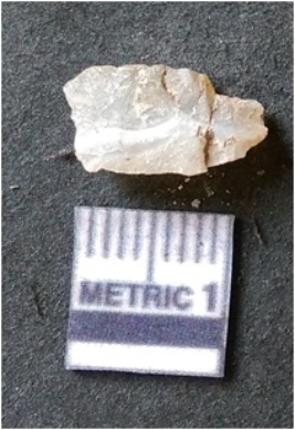 | Description / विवरण | The quartz flake has sharp flaked edges and pointed ends as a result of flaking. The piece is semi-transparent in nature with irregular fracture pattern. The piece is roughly triangular in shape and has a prominent bulb of percussion. |