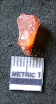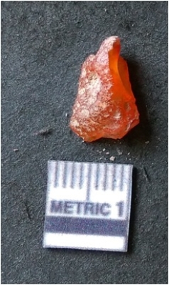 | Description / विवरण | It is carnelian flake red in color, with sharp flakes edges and a small bulb of percussion owing to knapping activity. The piece has sharp flaked edges and a crypto-crystalline matrix. |