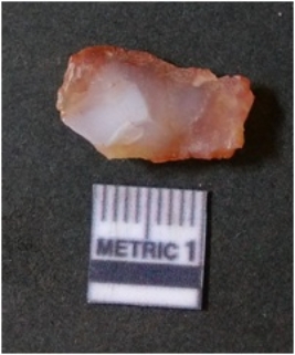 | Description / विवरण | The flake has irregular fracture pattern and sharp flaked edges as a result of lithic knapping activity. The piece is pale, with surfacial flake scars and a bulbous end. The quartz flake is rosy white in colour. |